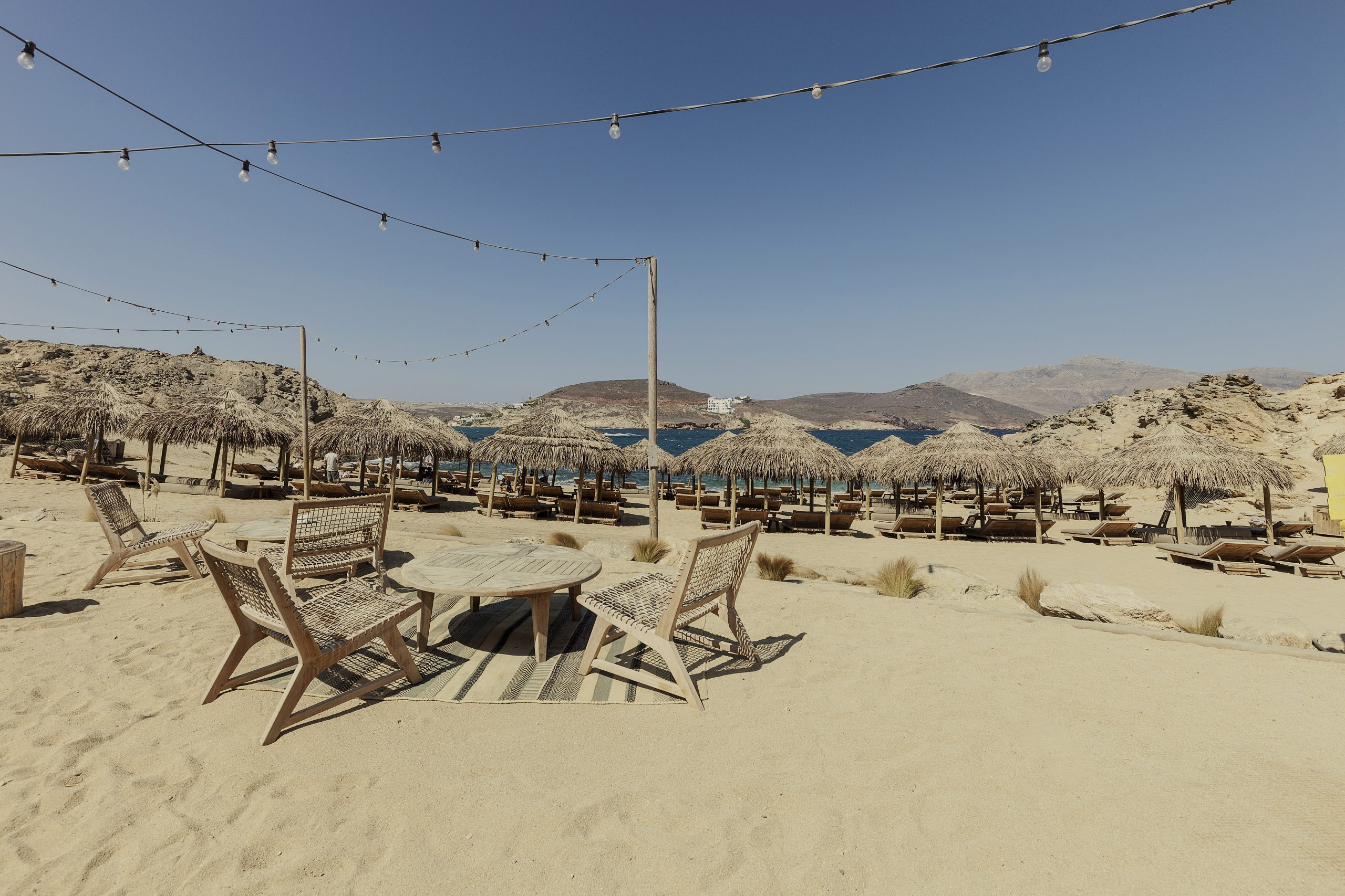 The design of Alemagou draws inspiration from nature, with earthy tones, natural wood, and organic materials that blend seamlessly into the environment. The beach club’s open-air structure features elegant, minimalistic furniture, rustic wicker pieces, and plenty of shaded spaces for guests to relax. The result is a space that feels like a serene, bohemian sanctuary, far from the hectic energy of Mykonos’ more commercial areas.