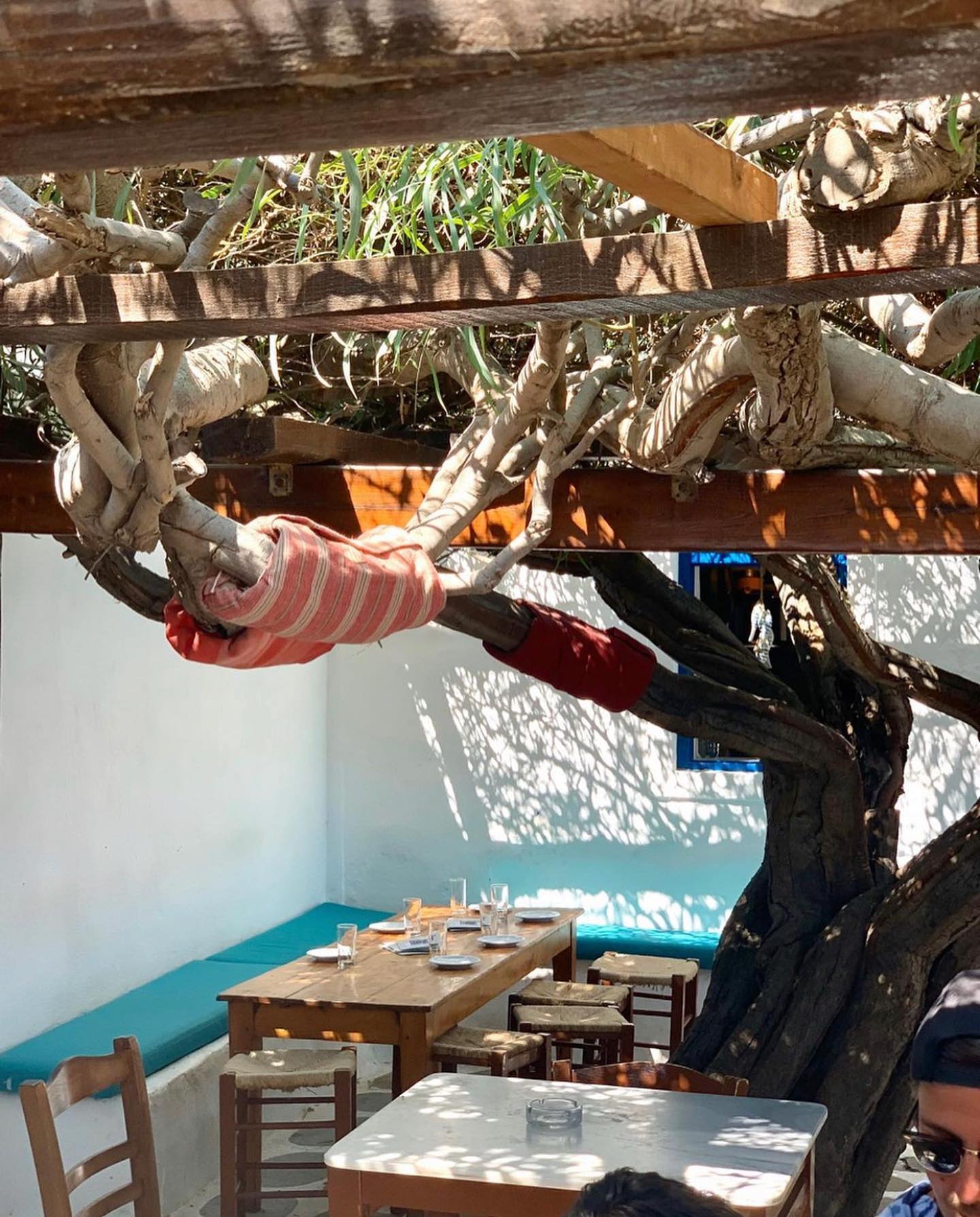 Hidden beneath a canopy of trees, Kiki's Tavern is intentionally discreet, lacking overt signage to preserve its intimate atmosphere. The absence of electricity contributes to its unpretentious and serene environment. Diners can enjoy their meals under the shade of trees, with the serene beach and the shimmering Aegean Sea serving as a picturesque backdrop.