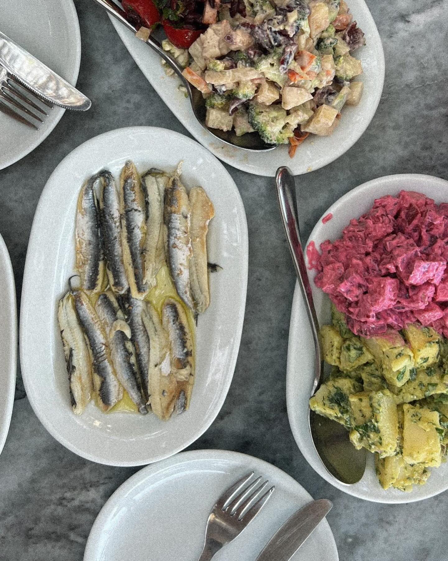 • Salads and Sides: A variety of fresh salads and sides, including baked feta, eggplant, and potatoes, complement the main courses.