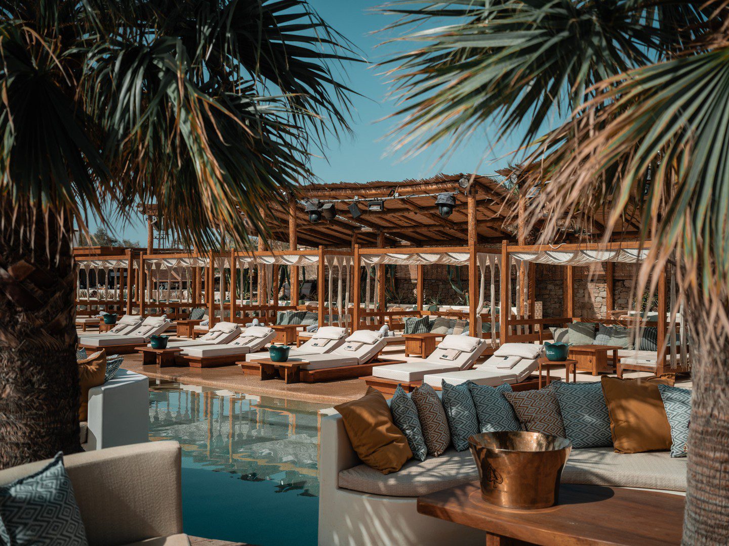 Upon entering SantAnna, guests are immediately immersed in a world of opulence. The club features an expansive outdoor space with a large pool, private cabanas, and lounge areas that offer breathtaking views of the Aegean Sea. The lush greenery, stylish furnishings, and elegant décor create a chic yet comfortable atmosphere, making it the perfect setting for a day of indulgence.