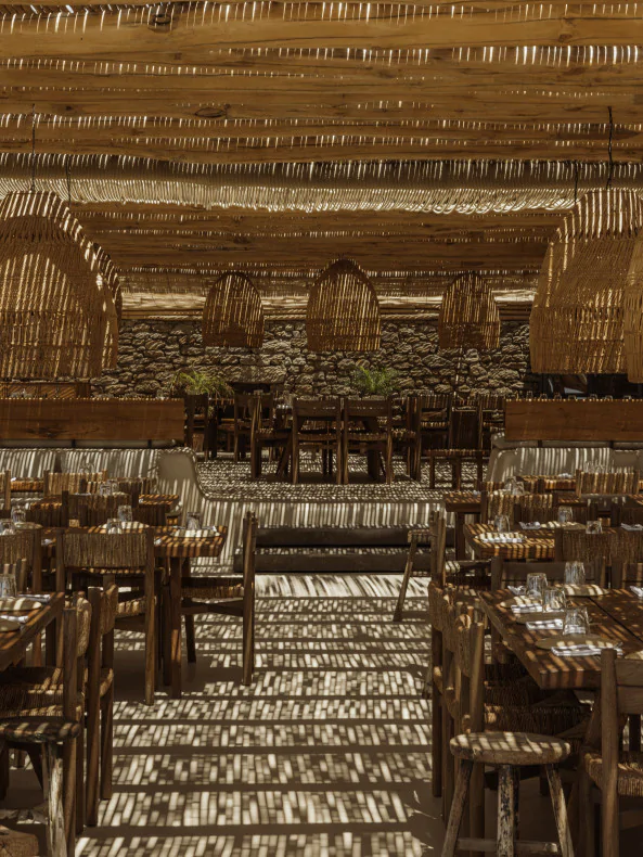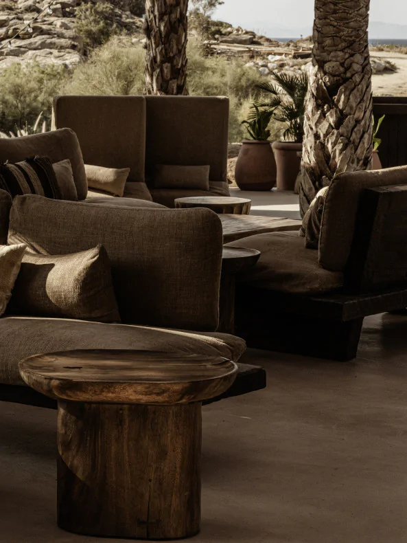 The design of Scorpios reflects the bohemian spirit of Mykonos but with a luxurious twist. The open-air space features minimalist decor, with large wooden beams, sandy tones, and carefully curated art pieces that evoke a sense of timeless elegance. The layout flows seamlessly from the beachside lounge to the infinity pool area, creating different zones for relaxation, socializing, and dining. Scorpios’ balance of design and natural beauty makes it not just a beach club but a living, breathing work of art.