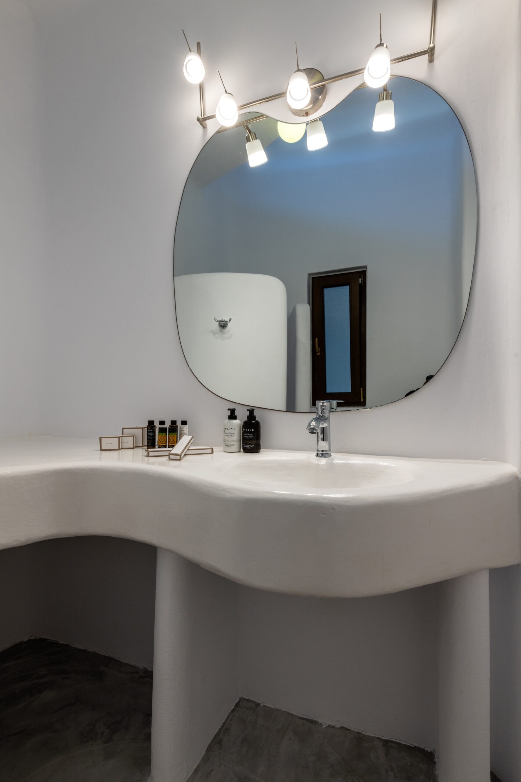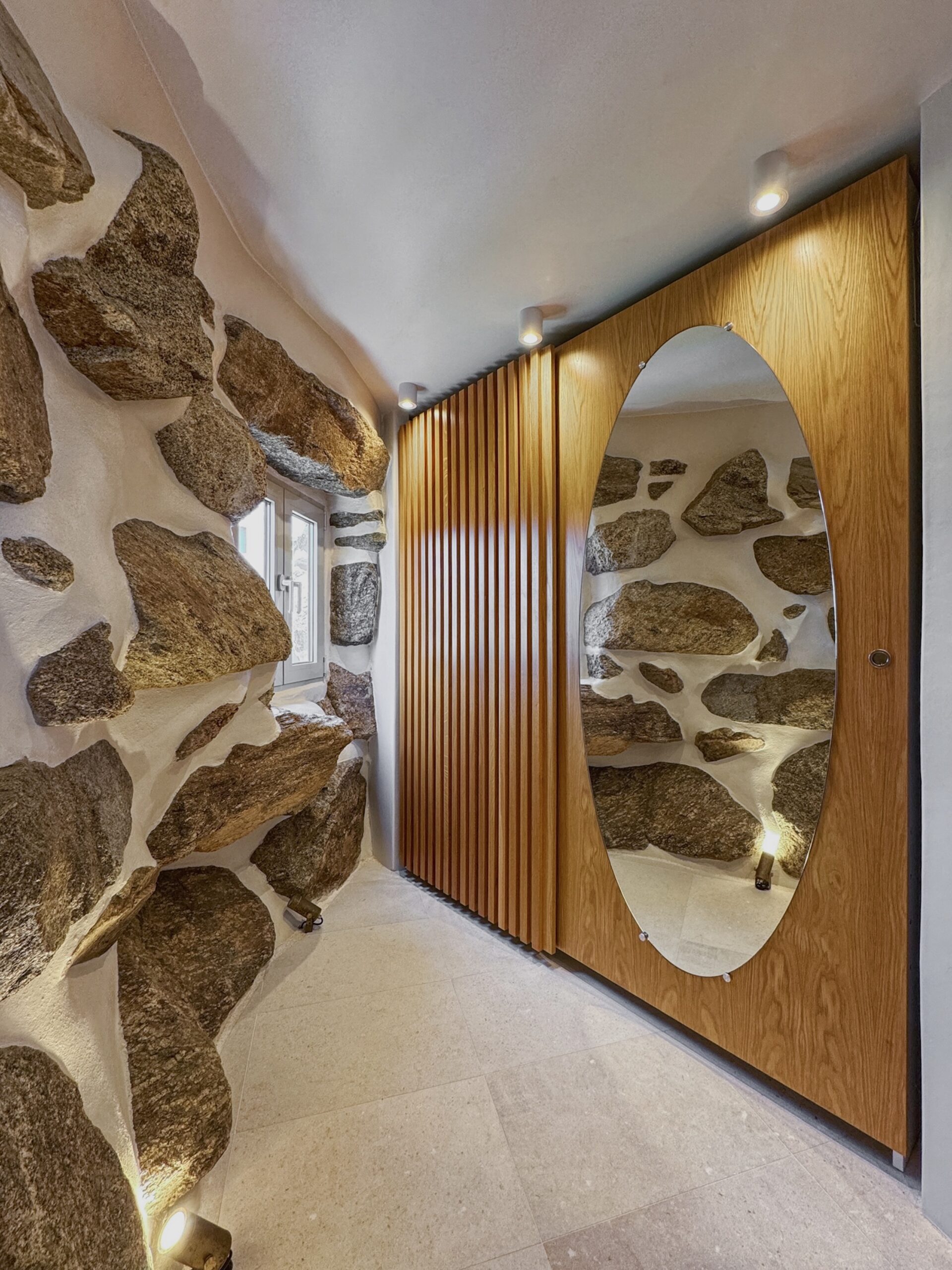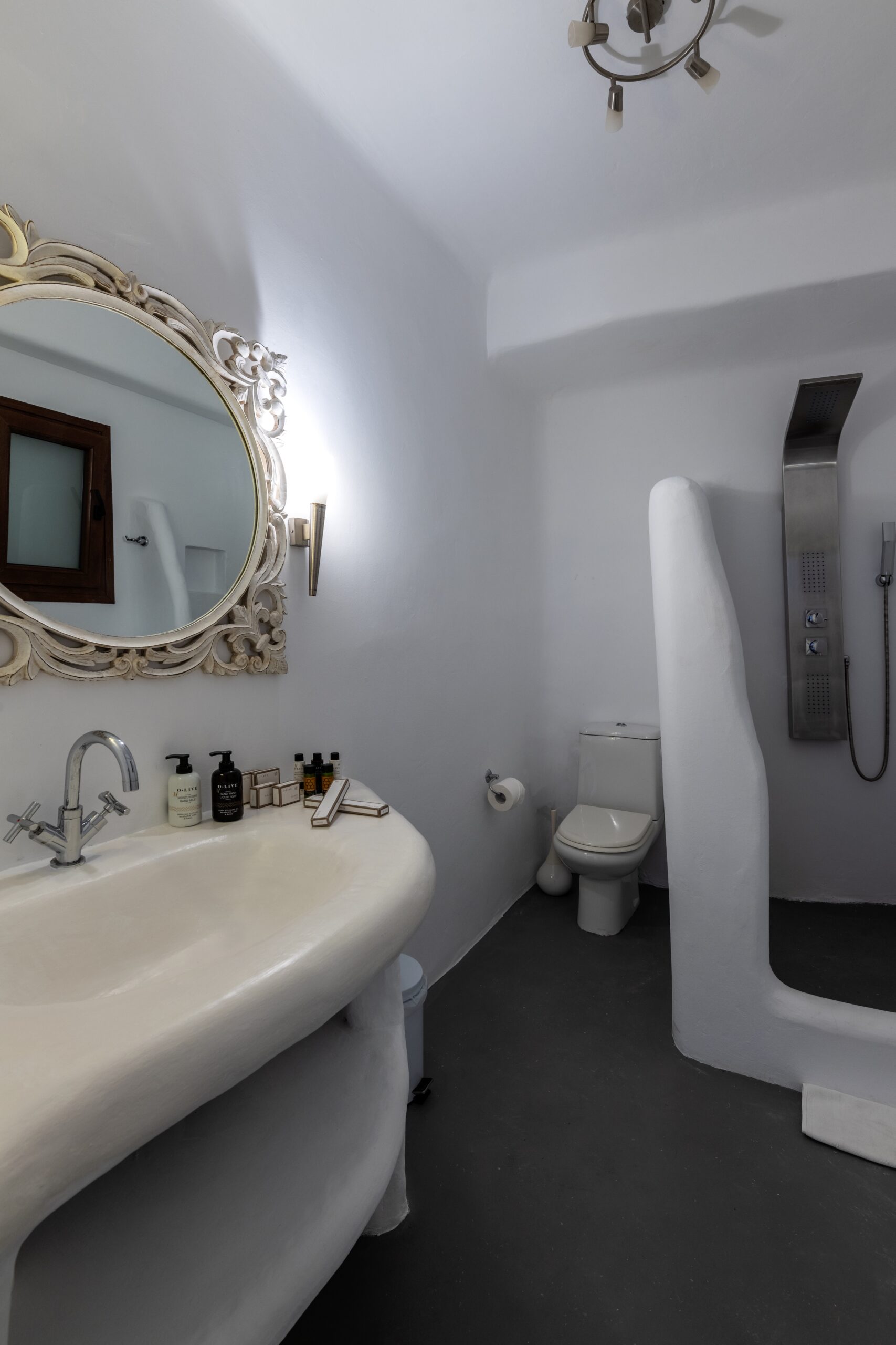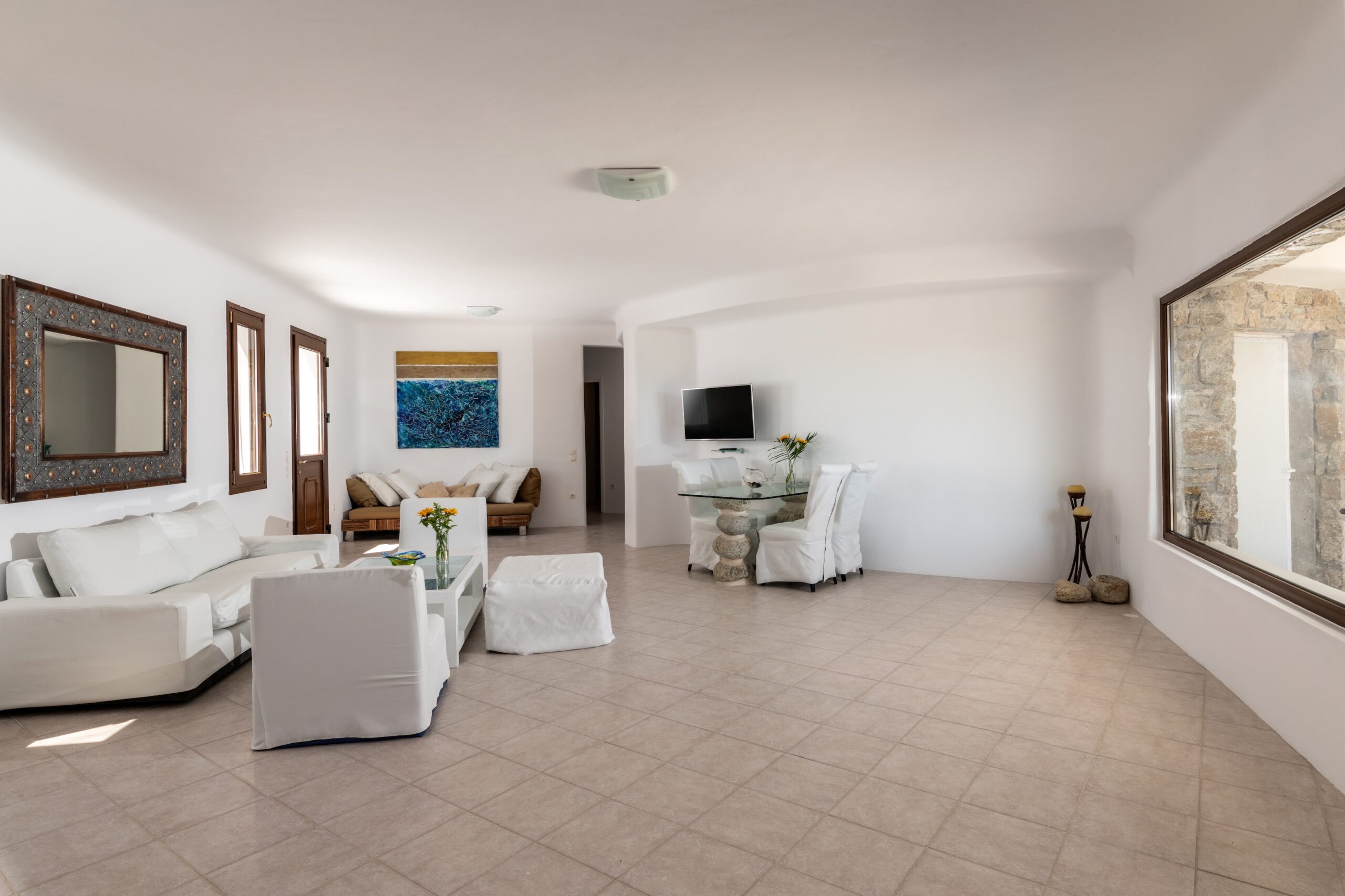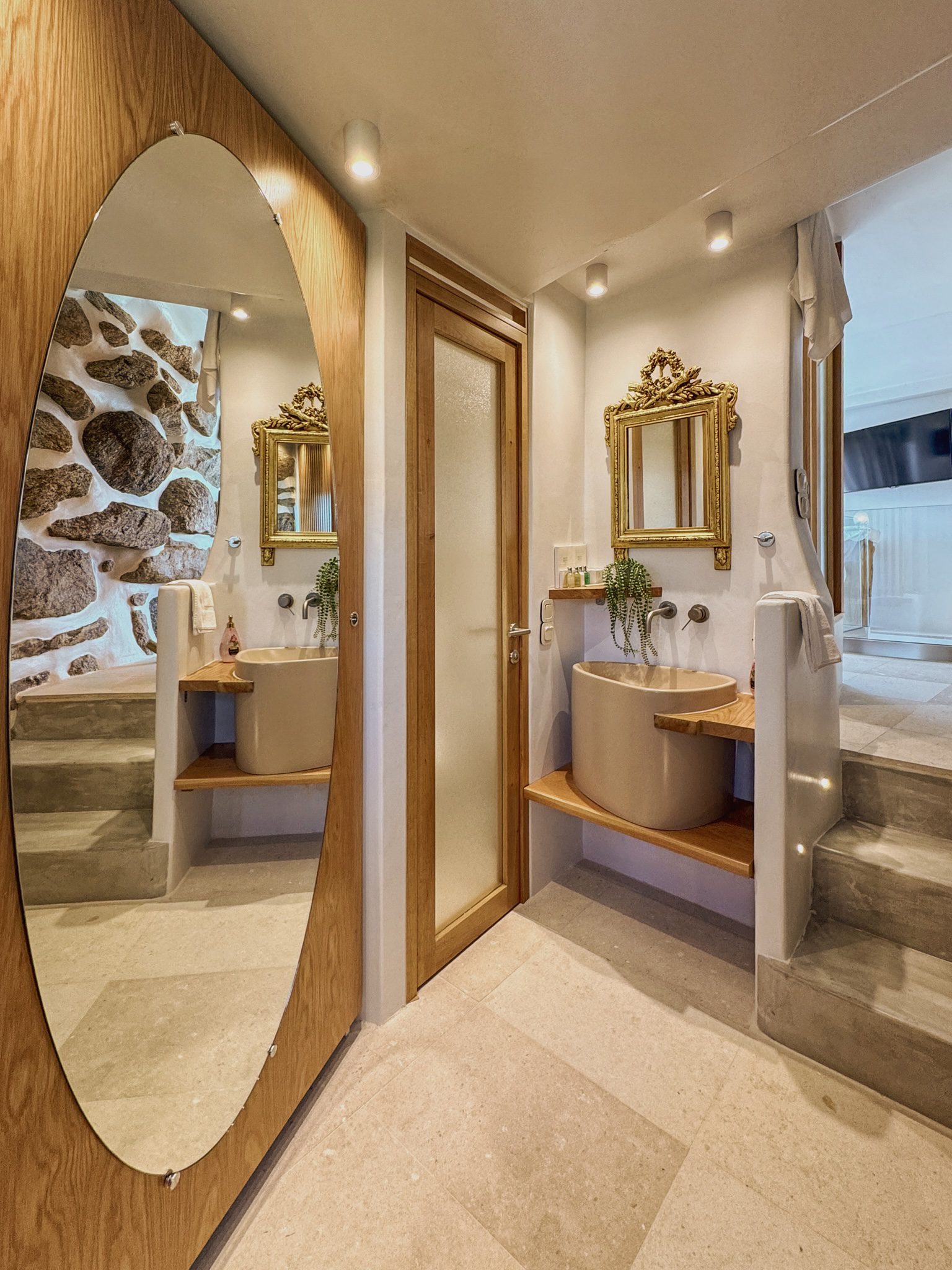 Entrance Floor: -Spacious living room with satellite TV and panoramic sea views, fully equipped kitchen, indoor dining area, cozy lounge spaces, glass-enclosed wine cellar/bar, laundry room, and guest WC. -Catering Kitchen: Reserved exclusively for villa staff use. -Romantic Suite [45 m²]: King-size bed, air conditioning, TV, safebox, mini-fridge, and ensuite bathroom with walk-in shower – sea view from the window. -Executive Suite [35 m²]: Super king-size bed, air conditioning, safebox, mini-fridge, sitting area, and ensuite bathroom with bathtub – direct access to the pool area via balcony doors. Upper Level: -Juliet Suite [55 m²]: Super king-size bed, air conditioning, safebox, mini-fridge, TV, and ensuite shower bathroom – balcony doors lead to an outdoor area. -Honeymoon Suite [60 m²]: Super king-size bed, TV, air conditioning, safebox, mini-fridge, and ensuite his-and-hers bathroom – opens onto a large terrace with heated Jacuzzi, outdoor lounge, and dining area.