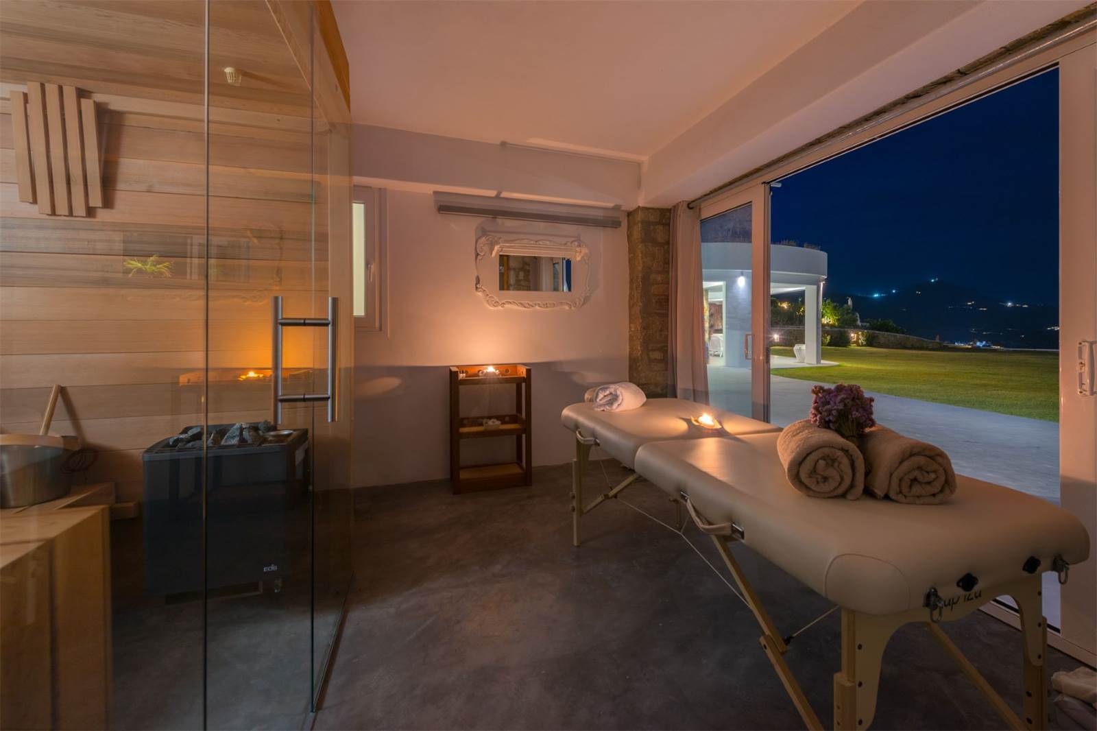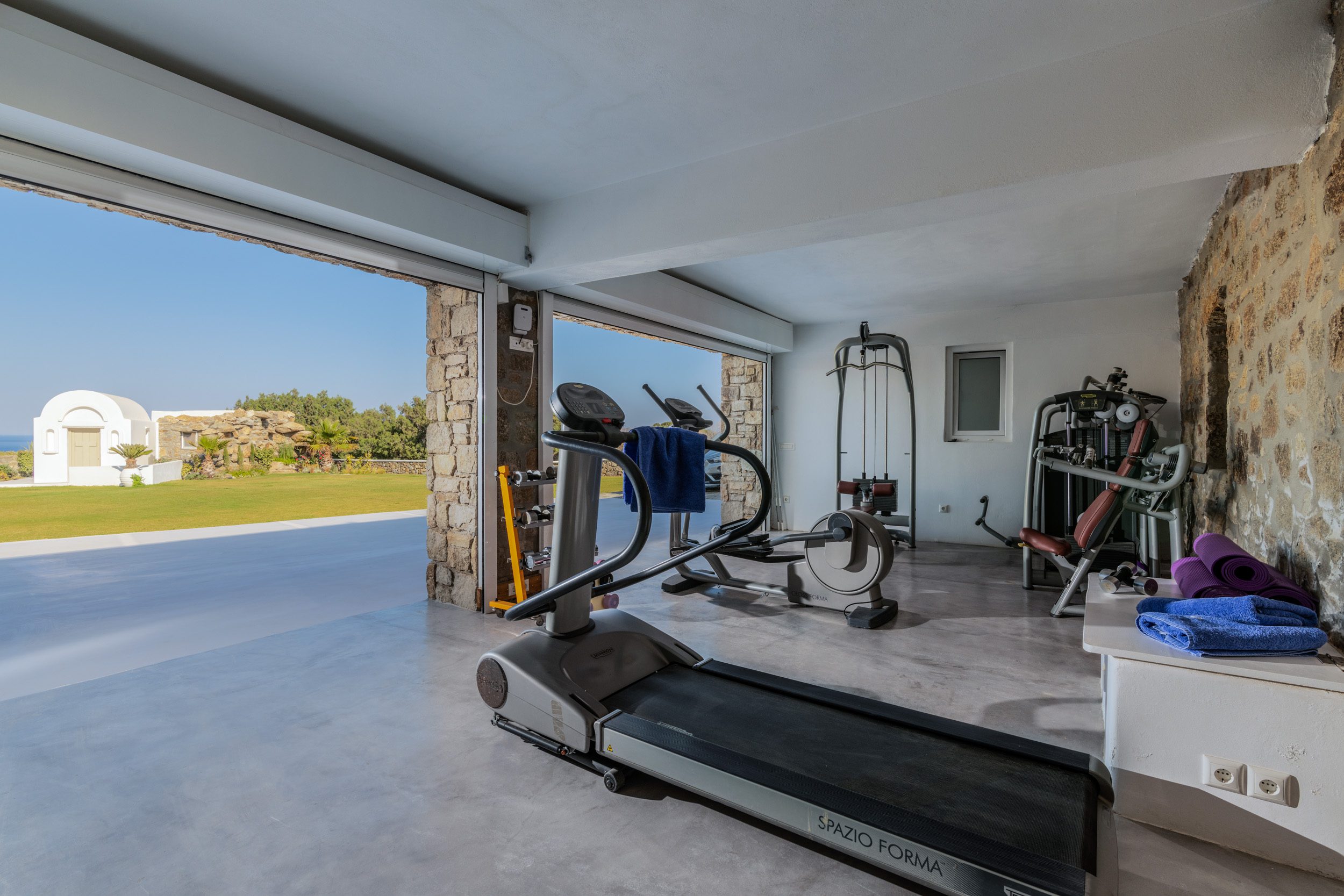 Entrance Floor: Infinity heated pool (22 m long, 250 m²) with “floating” bar and heated Jacuzzi, outdoor lounge, dining area for 10, pergola, pool bar with high chairs, private chapel, pool changing rooms, 2 pool WCs, and showers. Spa Room: Modern sauna, steam bath, and infrared therapy for ultimate relaxation. Independent Gym: Fully equipped with Technogym and training machines, overlooking the garden.