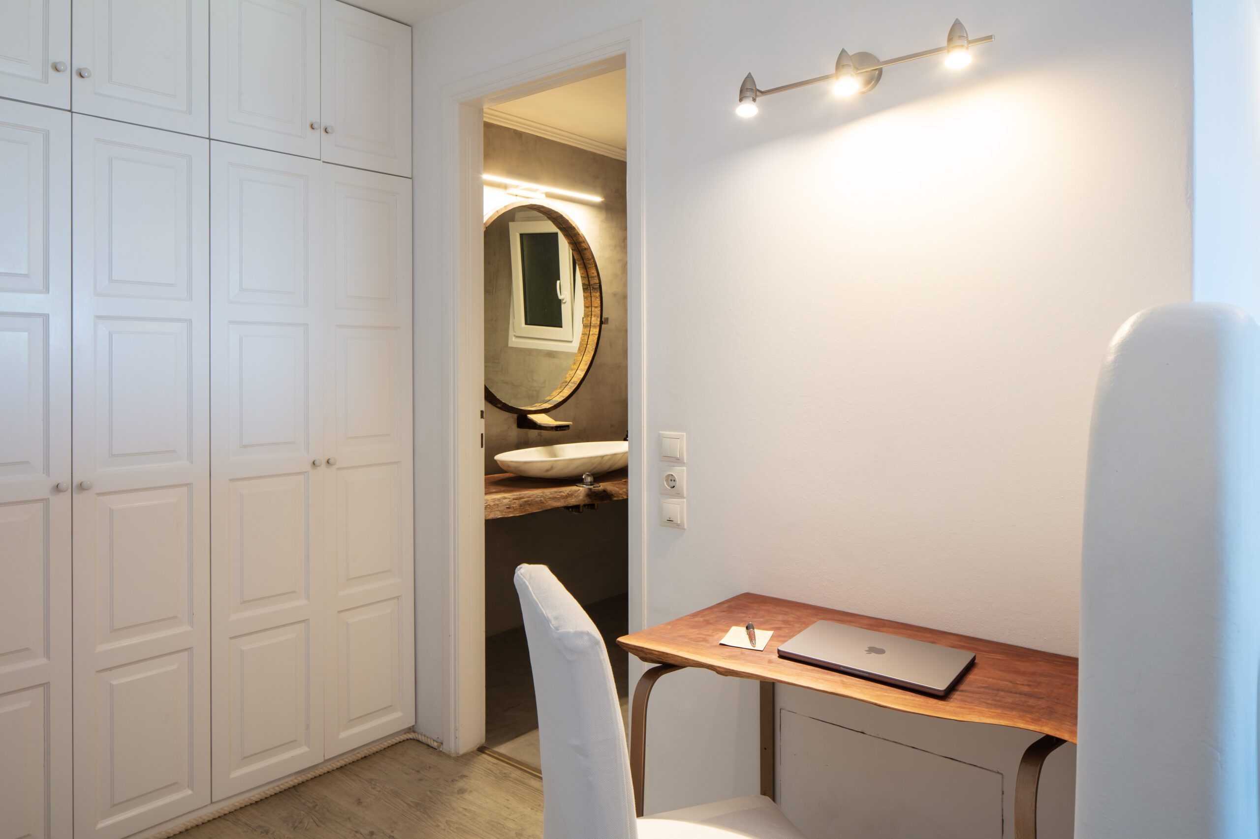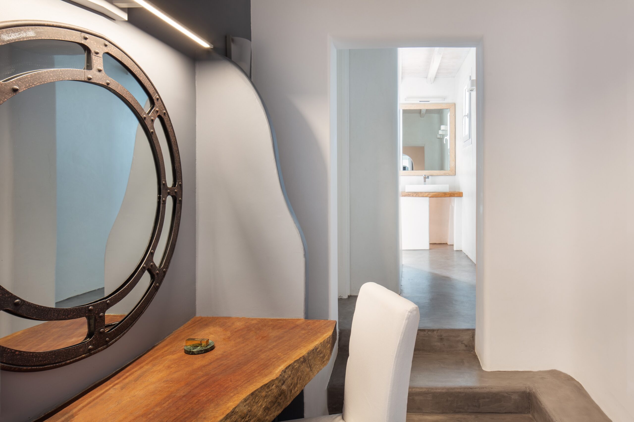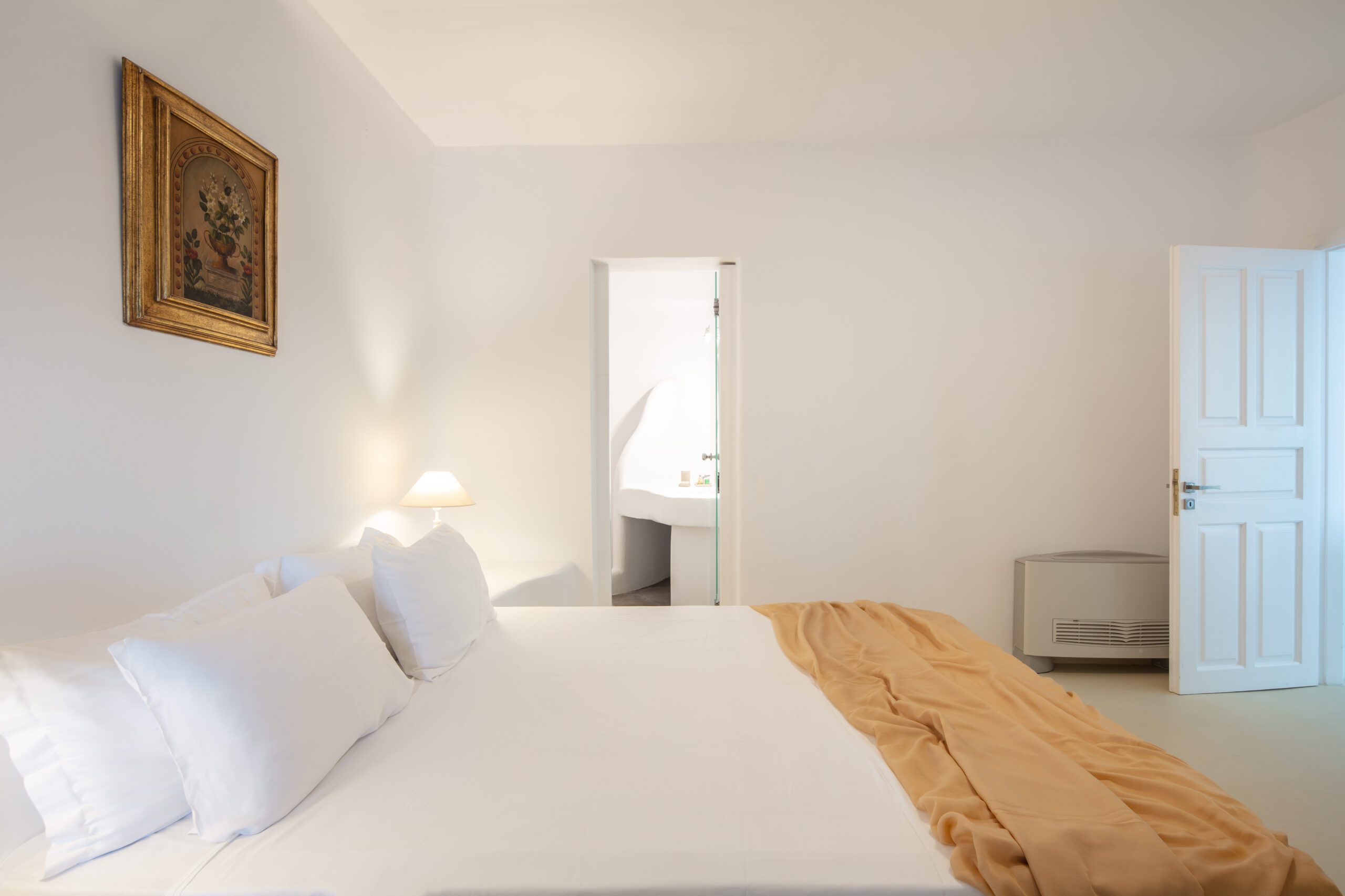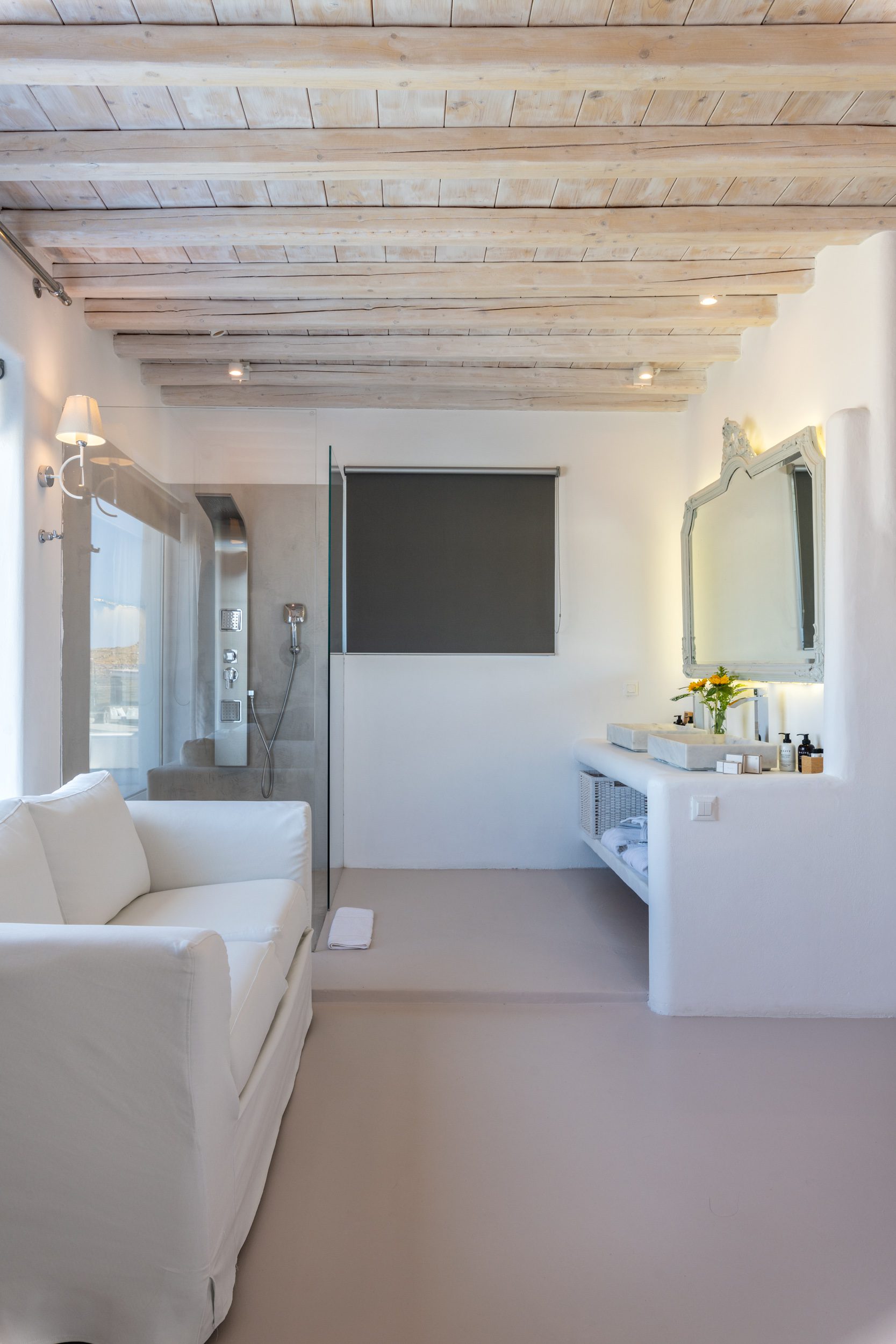 Entrance Floor: -Spacious living room with satellite TV and panoramic sea views, fully equipped kitchen, indoor dining area, cozy lounge spaces, glass-enclosed wine cellar/bar, laundry room, and guest WC. -Catering Kitchen: Reserved exclusively for villa staff use. -Romantic Suite [45 m²]: King-size bed, air conditioning, TV, safebox, mini-fridge, and ensuite bathroom with walk-in shower – sea view from the window. -Executive Suite [35 m²]: Super king-size bed, air conditioning, safebox, mini-fridge, sitting area, and ensuite bathroom with bathtub – direct access to the pool area via balcony doors. Upper Level: -Juliet Suite [55 m²]: Super king-size bed, air conditioning, safebox, mini-fridge, TV, and ensuite shower bathroom – balcony doors lead to an outdoor area. -Honeymoon Suite [60 m²]: Super king-size bed, TV, air conditioning, safebox, mini-fridge, and ensuite his-and-hers bathroom – opens onto a large terrace with heated Jacuzzi, outdoor lounge, and dining area.