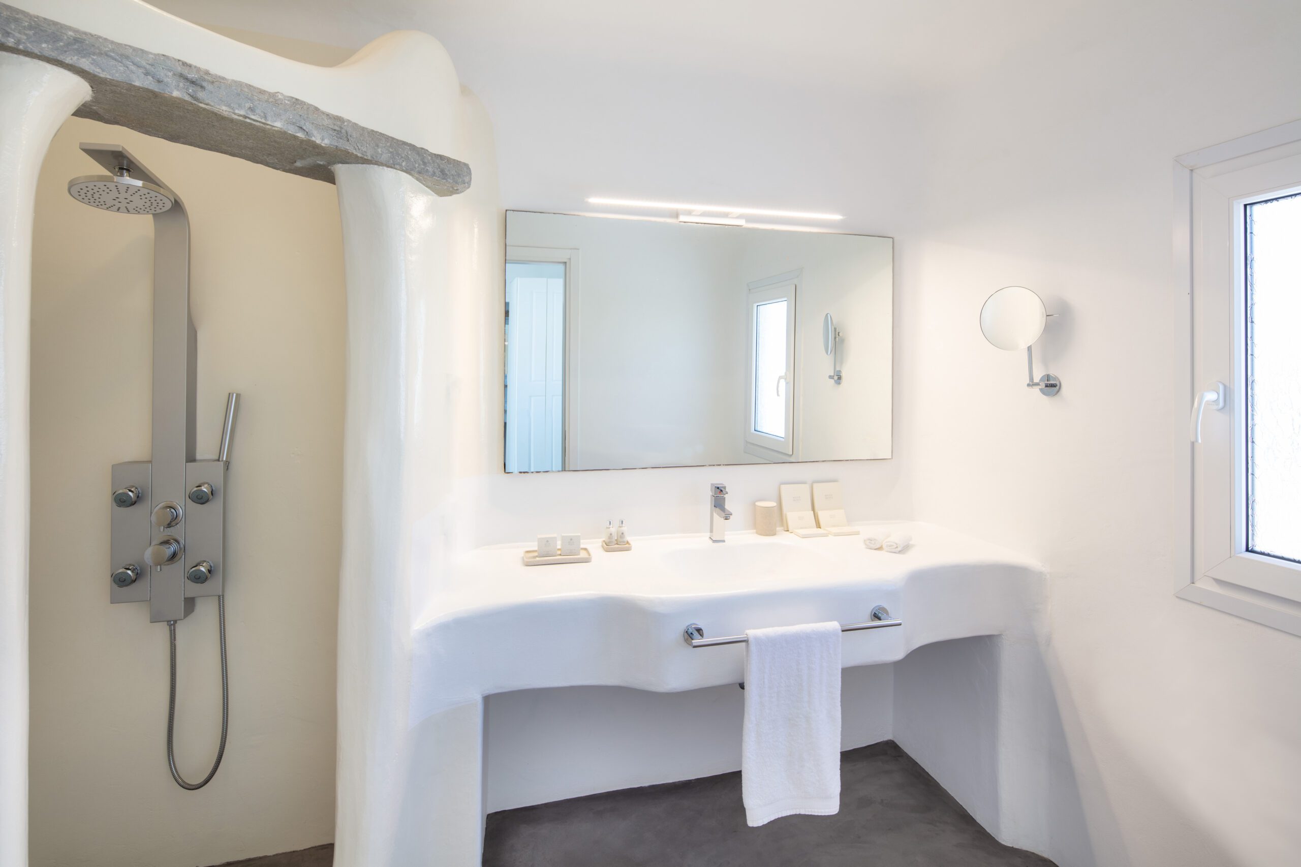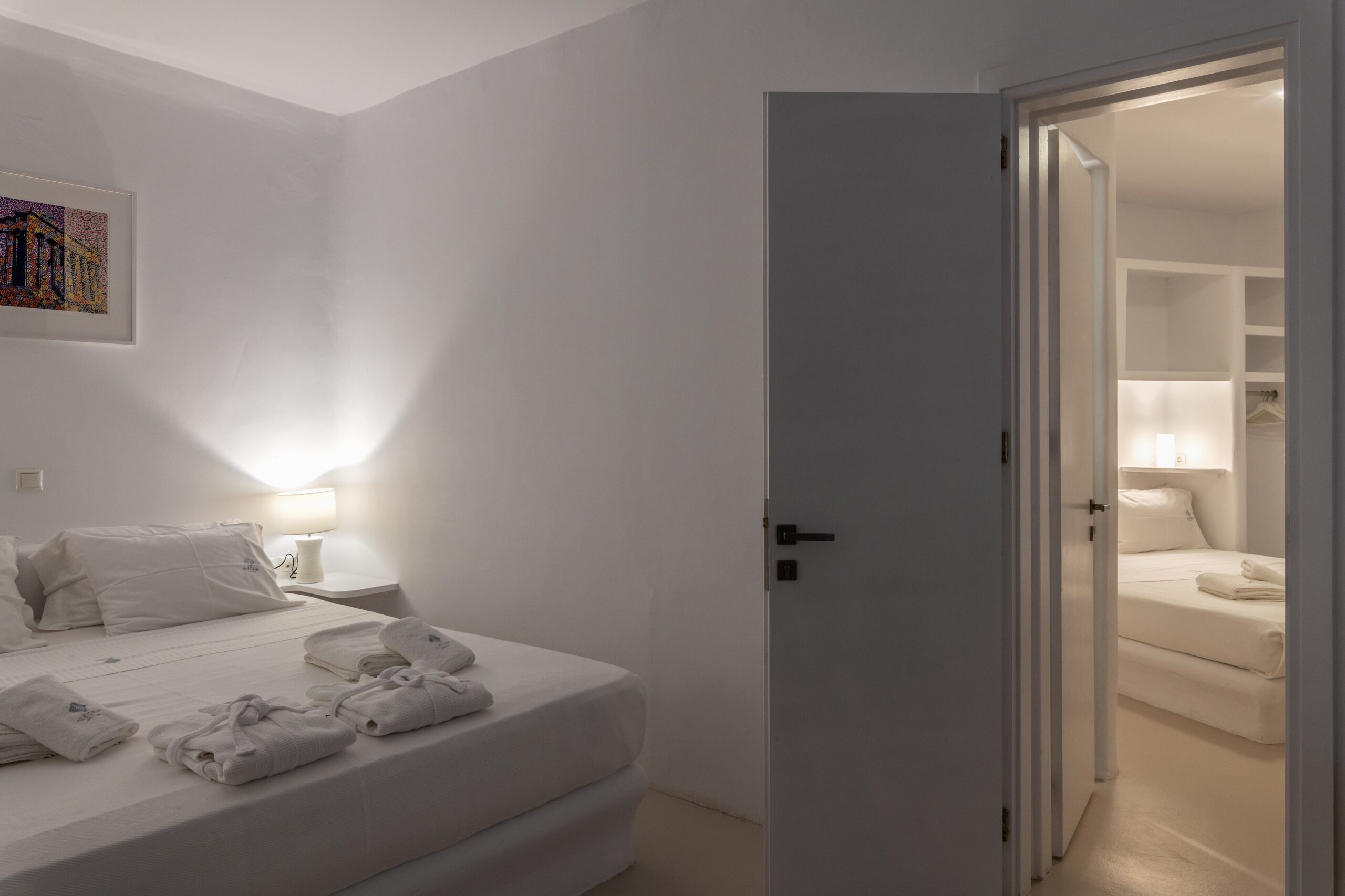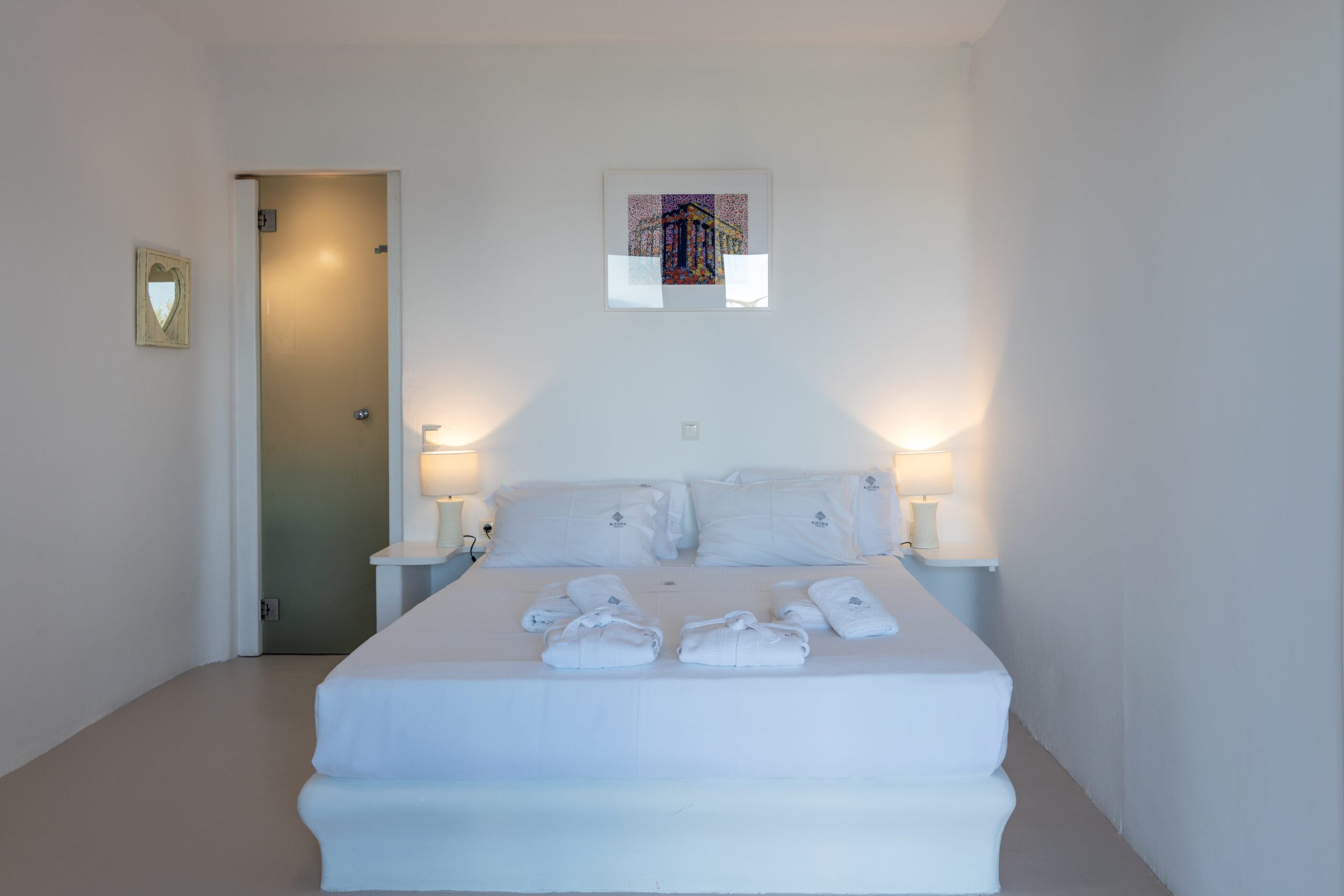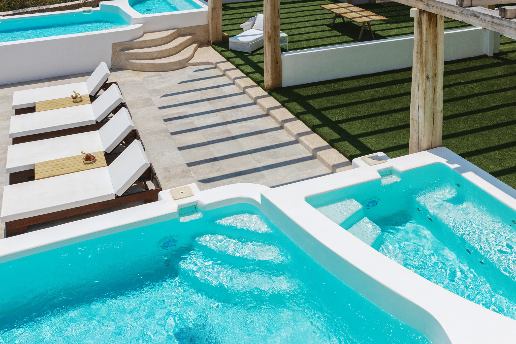 Pool Level: -Fully equipped kitchen, living room with satellite TV, indoor dining area for 6, breakfast bar with sea views, access to outdoor veranda with seating, lounge area, BBQ, and private entrance. Upper Level: -Extravaganza Suite [55 m²]: Super king-size bed, air conditioning, TV, safebox, mini-fridge, open-plan shower, and ensuite WC – terrace access via balcony doors. Garden Level: -Premium Suite [60 m²]: Super king-size bed, air conditioning, safebox, ensuite shower bathroom, kitchenette, separate living room – option to interconnect with Deluxe Room. -Superior Sea View Room 1 [ 30 m², ] King-size bed, air conditioning, mini-fridge, safebox, ensuite shower bathroom – balcony access to outdoor area. -Superior Sea View Room 2 & 3 [ 32, 35 m², ]: Super king-size bed, air conditioning, mini-fridge, safebox, open-plan shower, and ensuite WC – both with outdoor access via balcony doors.